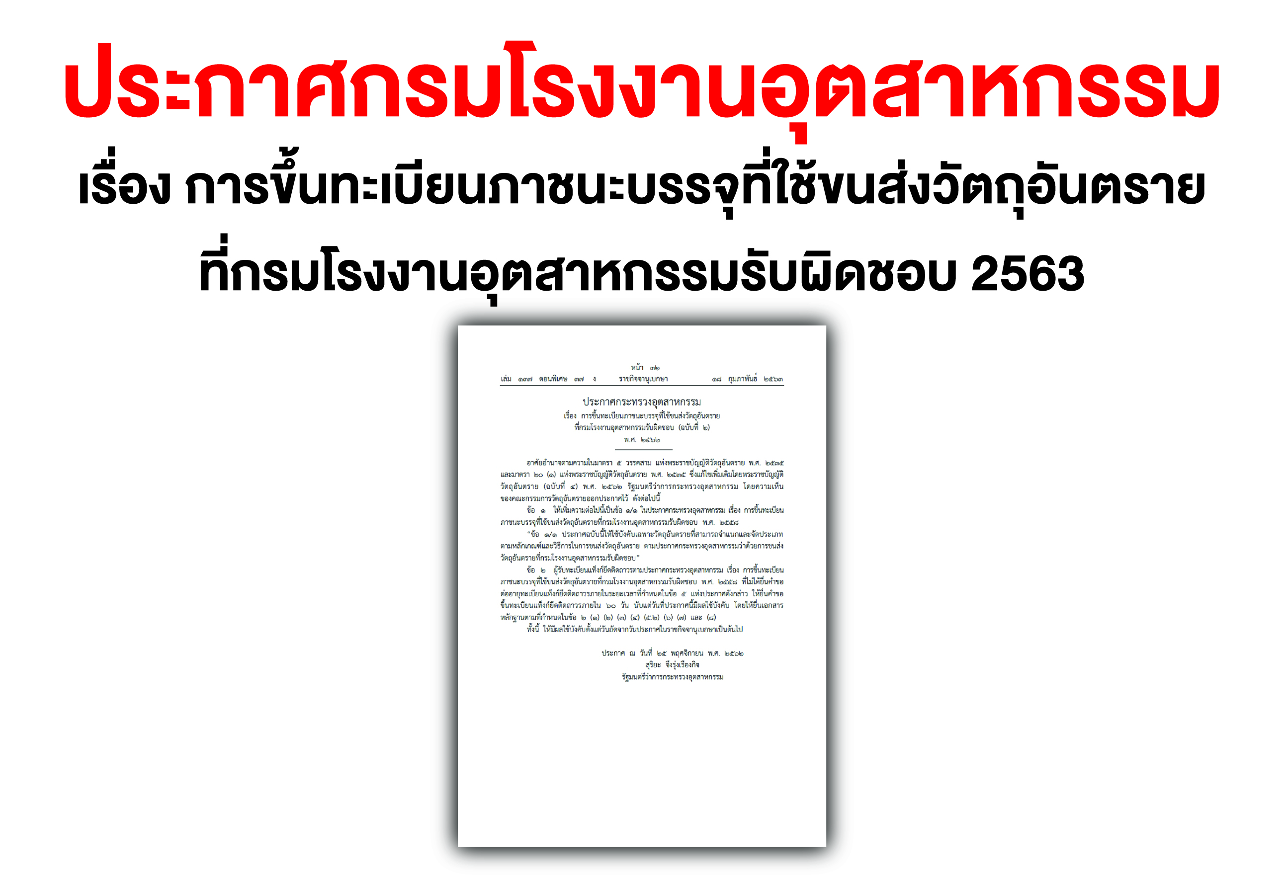 ประกาศกรมโรงงานอุตสาหกรรม เรื่อง การขึ้นทะเบียนภาชนะบรรจุที่ใช้ขนส่งวัตถุอันตรายที่กรมโรงงานอุตสาหกรรมรับผิดชอบ 2563