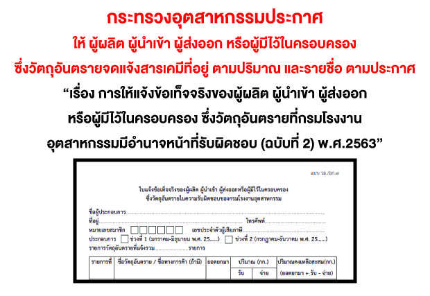 กระทรวงอุตสาหกรรมประกาศ ให้ ผู้ผลิต ผู้นำเข้า ผู้ส่งออก หรือผู้มีไว้ในครอบครอง ซึ่งวัตถุอันตรายจดแจ้งสารเคมีที่อยู่ ตามปริมาณ และรายชื่อ ตามประกาศ “เรื่อง การให้แจ้งข้อเท็จจริงของผู้ผลิต ผู้นำเข้า ผู้ส่งออก หรือผู้มีไว้ในครอบครอง ซึ่งวัตถุอันตรายที่กรมโรงงานอุตสาหกรรมมีอำนาจหน้าที่รับผิดชอบ (ฉบับที่ 2) พ.ศ.2563”